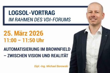 LOGSOL-Vortrag im Rahmen des VDI-ForumsDie Brownfield-Challenge: Das Runde muss ins Eckige Mittwoch, 25. März 2026 von 11:00 – 11:50 Uhr Michael Borowski, Dipl.-Ing. und Member of the Management Board der LOGSOL GmbH spricht über „Automatisierung im Brownfield – zwischen Vision und Realität“. Eventdatum: Mittwoch, 25. März 2026 11:00 – 11:50 Eventort: Weiterlesen…